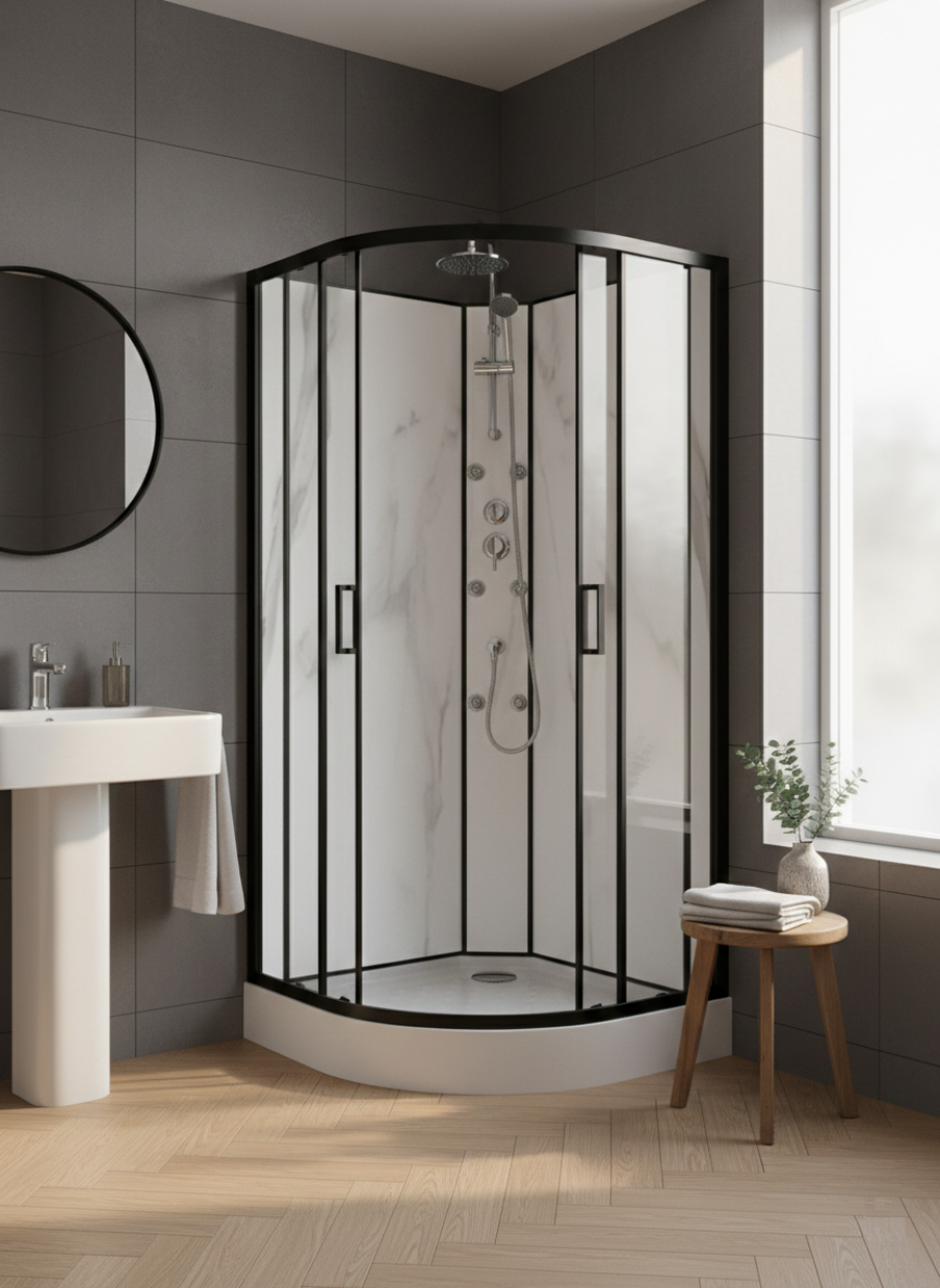 Avec ses lignes courbes et sa finition noire mate, cette cabine de douche quart de rond s’intègre parfaitement aux salles de bain actuelles, notamment les ambiances industrielles, minimalistes ou haut de gamme.