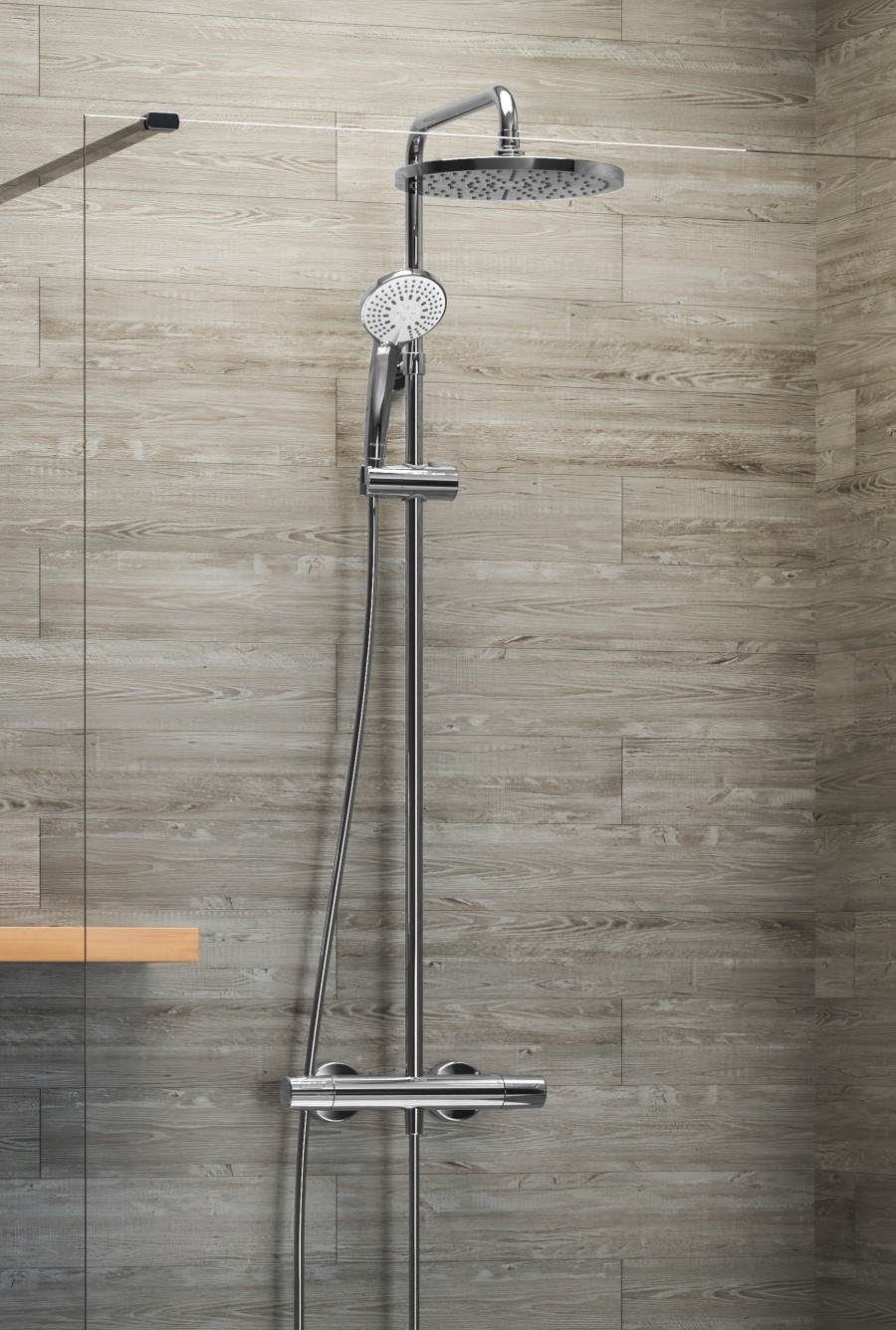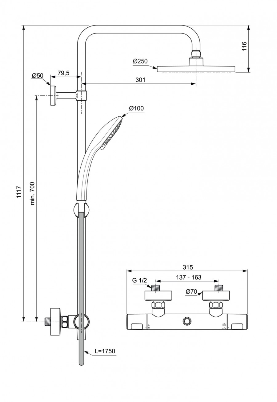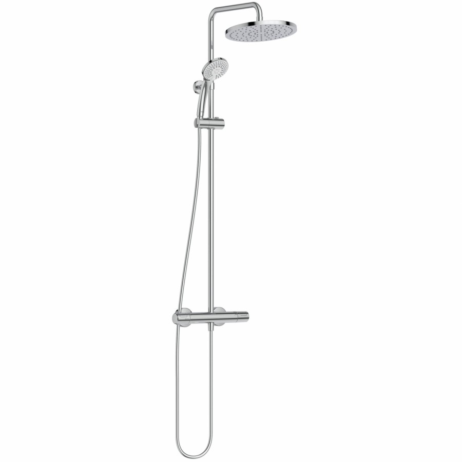 Colonne de douche thermostatique NF - Temp MAX 50°C - Douche de tête 250mm - Douchette 100mm 3 jets - Flexible antitorsion 1,75 m - inverseur dans la poignée - butées à 50 % du débit et à 40°C - corps tiède.