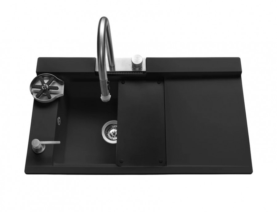 Evier à encastrer de cuisine multifonctions Granit Noir et Chromé - L910
