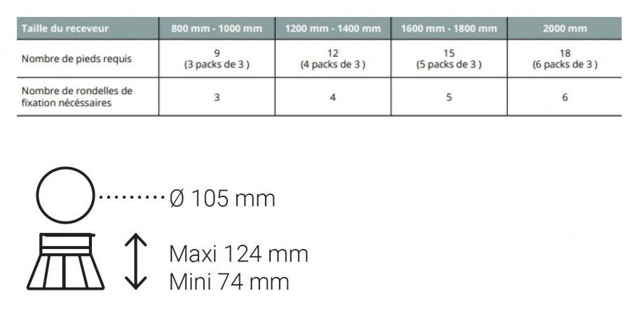 Réglables de 74mm à 124mm, permettant une installation comprise entre 100 et 150mm (receveur Onyx compris).