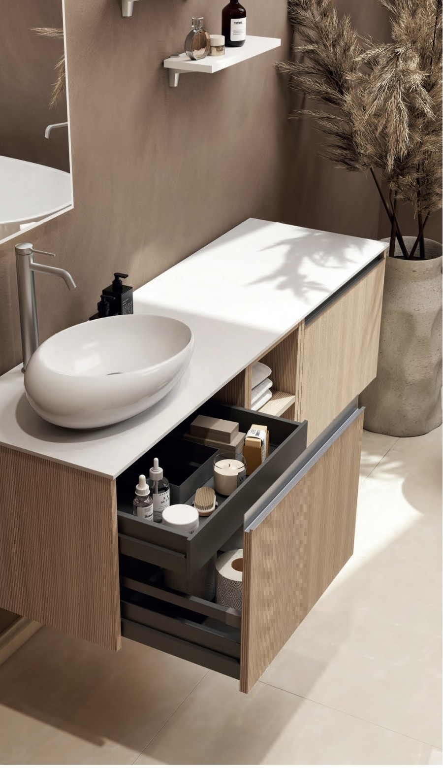 Parce qu'on n'a jamais assez de rangement, la gamme STRIATO propose un meuble de complément assorti au meuble de salle de bain.