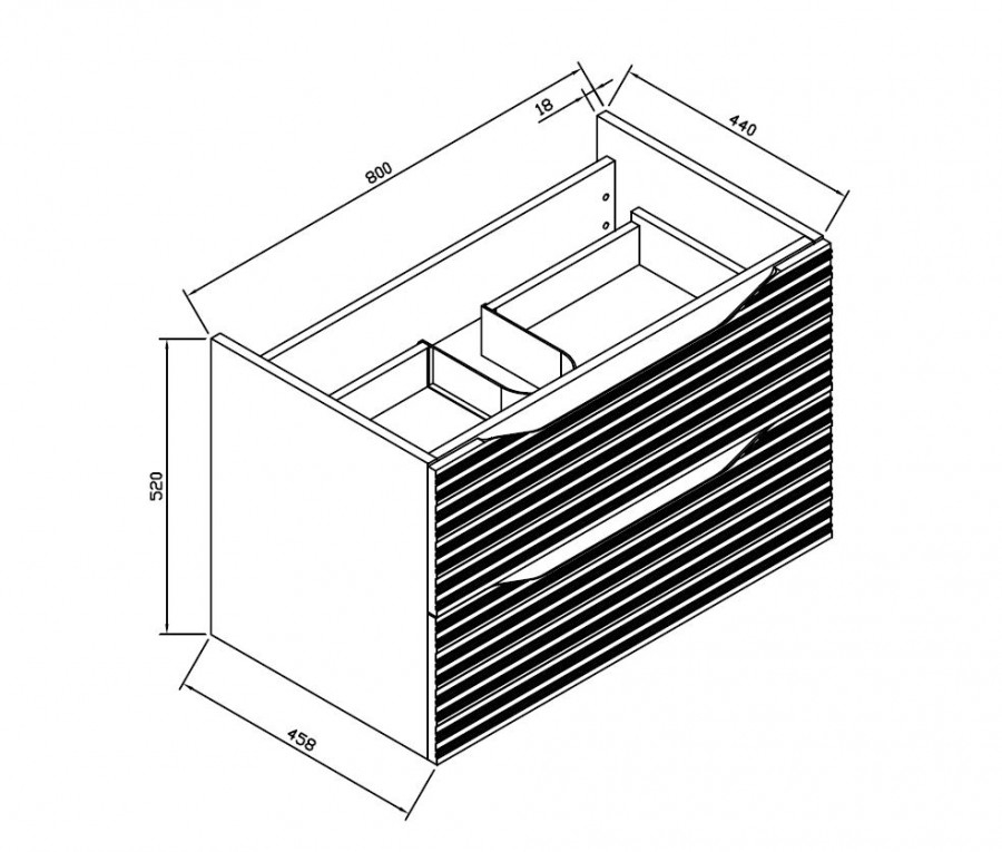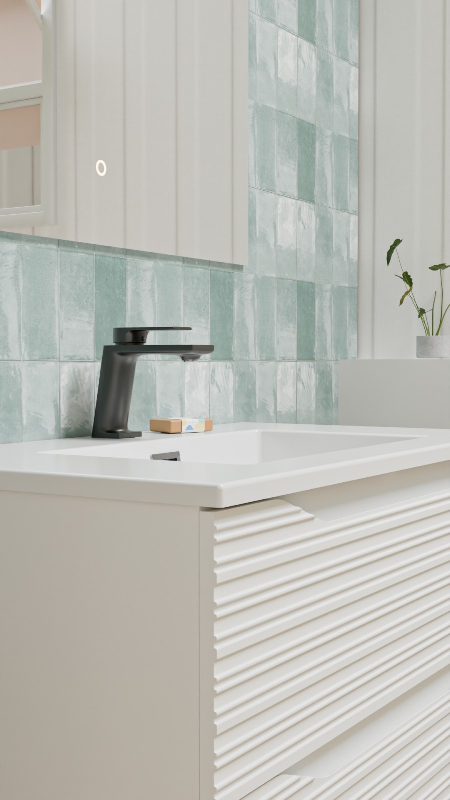 La véritable signature du modèle Structura réside dans ses façades structurées. Les lignes horizontales en relief créent un rythme visuel dynamique qui accroche la lumière, rompant avec la monotonie des meubles de salle de bain classiques. Son coloris blanc brillant renforce cet aspect moderne tout en facilitant l'entretien au quotidien.