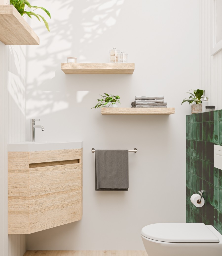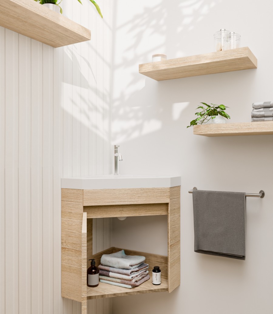 Avec sa finition en bois clair, ce meuble apporte une touche chaleureuse et naturelle à votre décoration intérieure. Son design minimaliste, accentué par une poignée intégrée discrète et une vasque blanche en résine, s'adapte à tous les styles : du moderne au bohème chic.