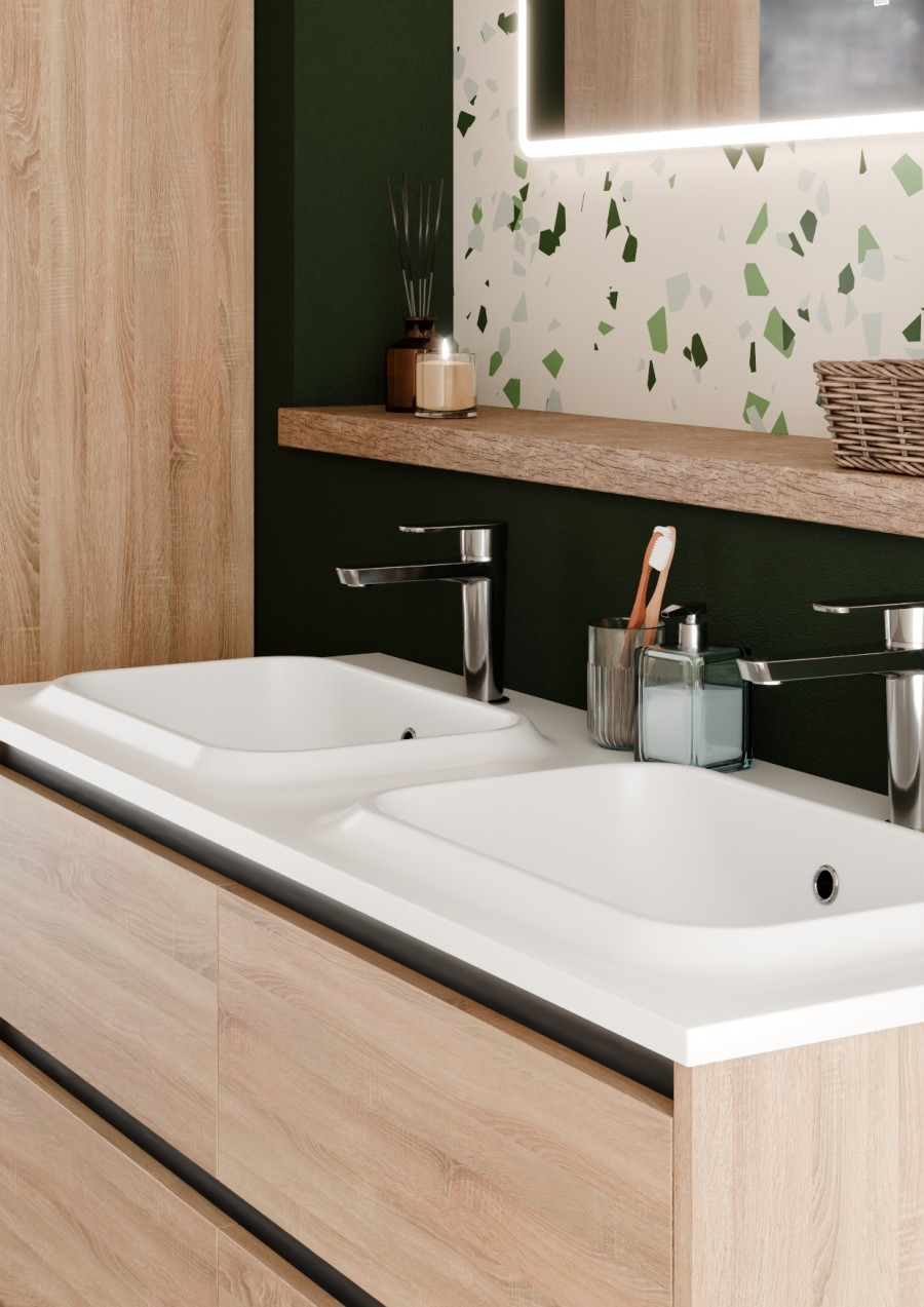 Les formes contemporaines de la double vasque DUNE et sa couleur blanc pur s'intègrent parfaitement à tous les styles de salle de bain design, des plus minimalistes aux plus sophistiqués.
