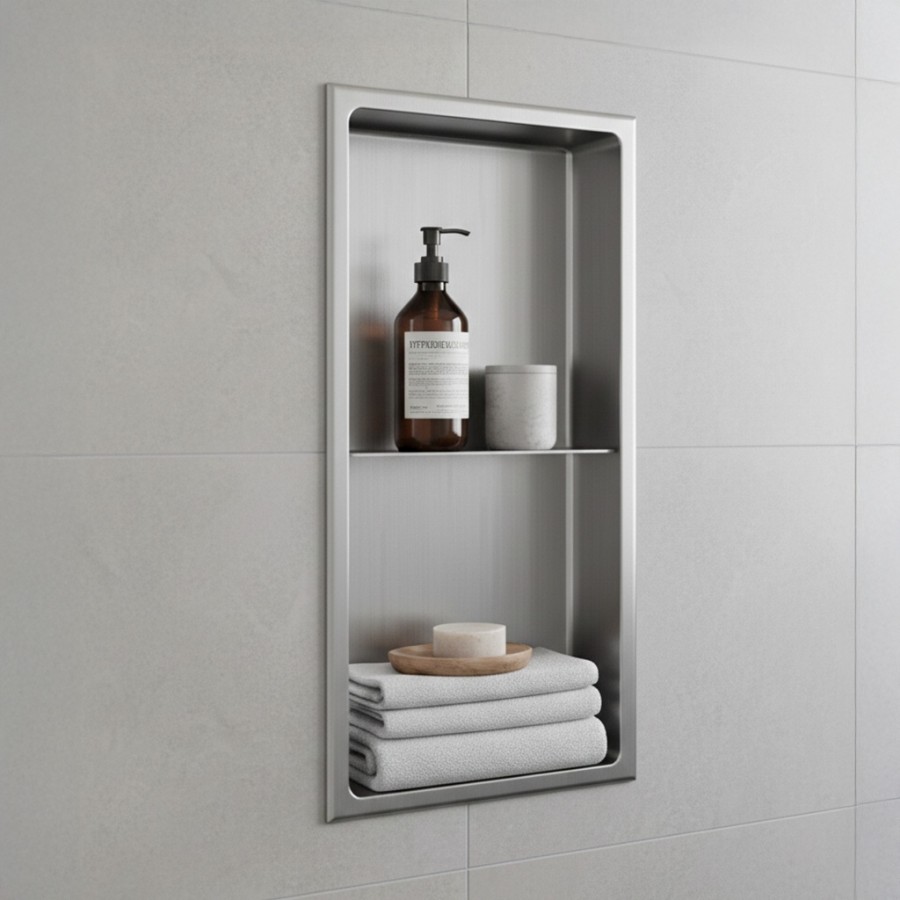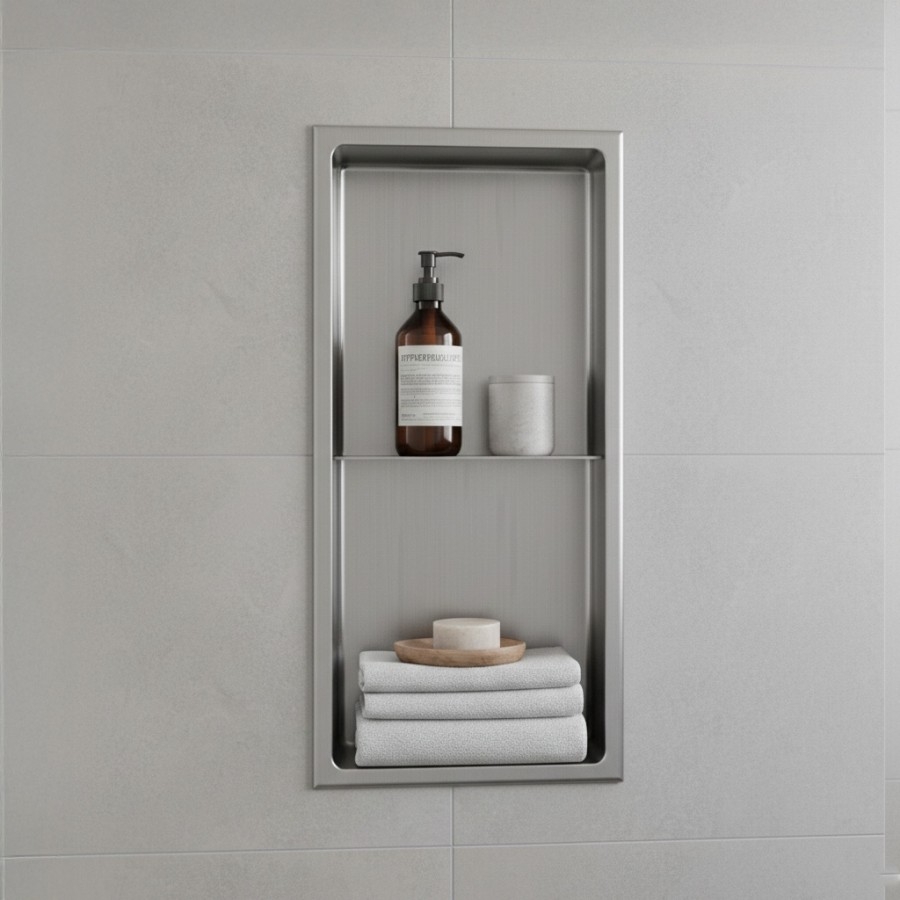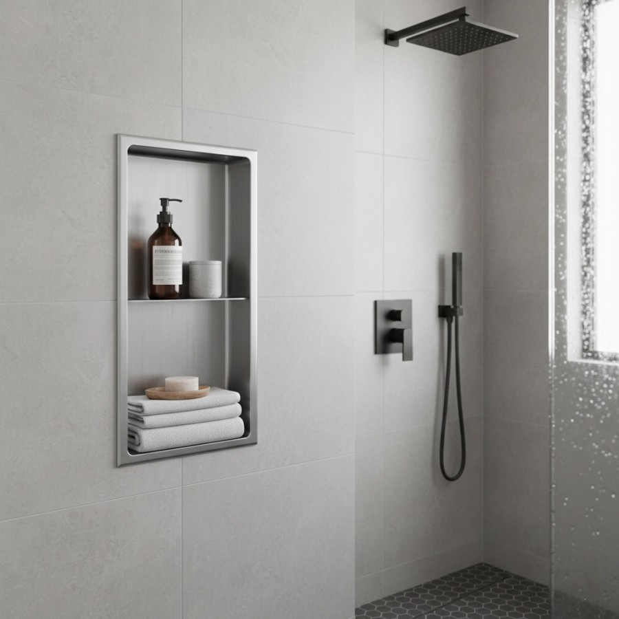 La niche en acier inoxydable élargit l'espace de rangement de votre salle de bain tout en la rendant confortable et moderne.