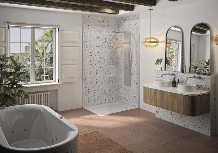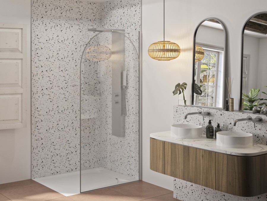 La paroi Arkade rompt avec la monotonie des lignes droites. Sa courbe et sa sérigraphie en arche doré apporte une touche de noblesse et de douceur, créant un écrin luxueux pour votre espace bien-être. Sa structure fine mais robuste souligne avec précision la zone de douche tout en conservant une sensation d’ouverture et de légèreté.