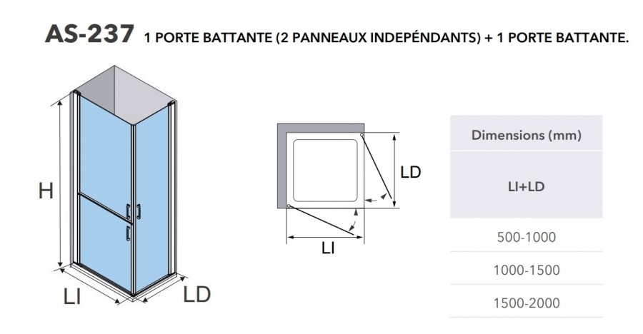 Porte de douche battante d'angle composé d'une porte battante avec 2 panneaux indépendants + 1 porte battante.