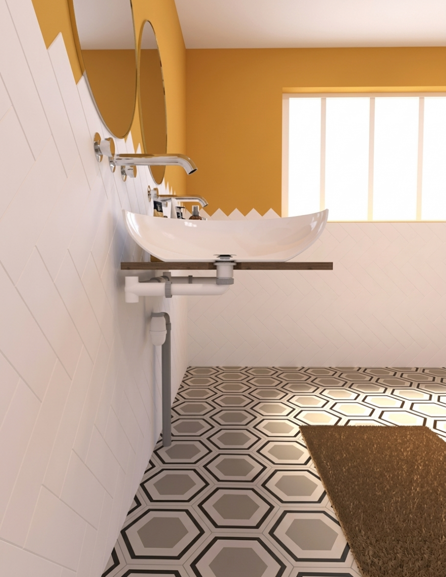 Le siphon avec sortie en diamètre 32 mm, est déporté pour dégager de la place dans le meuble sous vasque et gagner en rangement ou pour permettre l'accessibilité aux personnes à mobilité réduite.